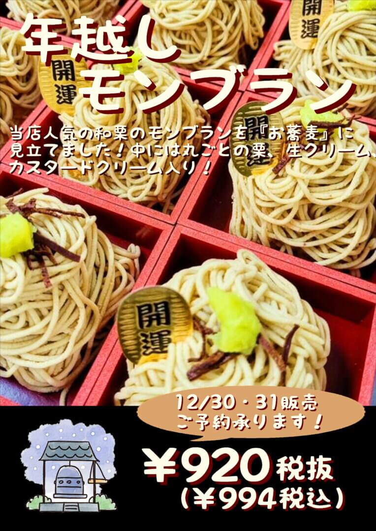 商品情報 年越しモンブランご予約承ります! 2025年12月4日 / 12/30、31の年末2日間限定で毎年恒例の「年越しモンブラン」を数量限定で販売いたします!本物のお蕎麦と見間違えてしまいそうな見た目も楽しいスイーツです♪ご予約は店頭または 📞お電話にてご予約承っております!皆様のご利用をお待ちしております🙌